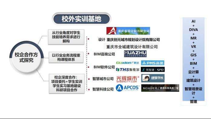 校外实战:与重庆市规划展览馆、重庆金鑫科技、重庆绿色建筑科技、重庆光辉城市等 6家企业共建实训基地,开展认知实习、跟岗实训、顶岗实习递进式实践。