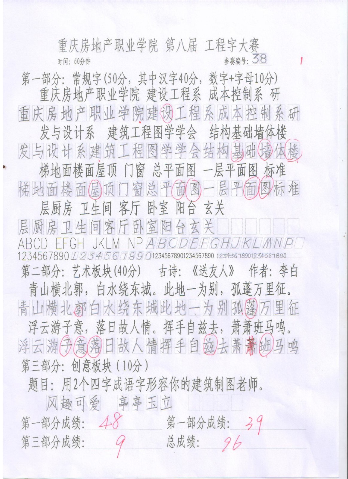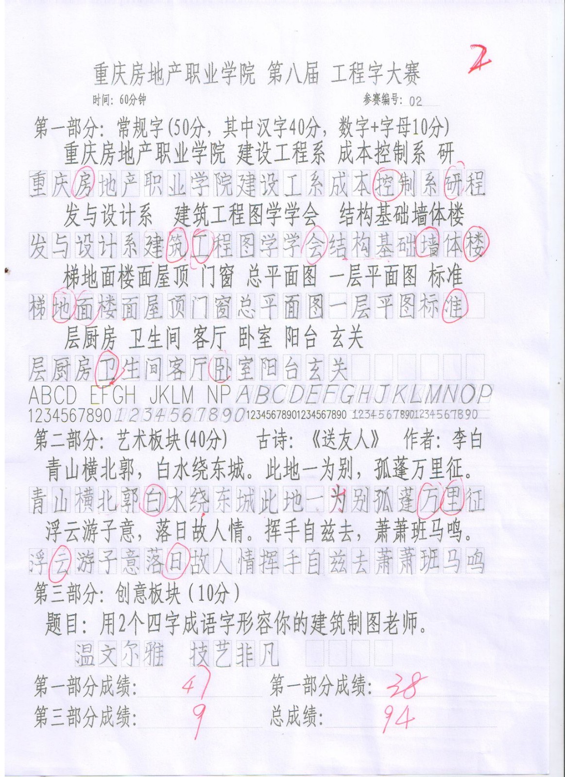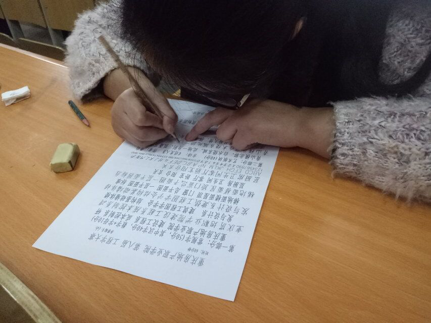本次比赛的主办为建设工程系基础教研室,协办工程图协学会,在全校范围内报名,征集优秀学子参加,要求参赛同学在一张工程字纸上按照规定书写,时长一小时,比赛遵循“又快又好”原则给予加分。比赛期间,赛场秩序井然、严肃认真。工程字的比赛不但能激发学生对于学习的积极性,更能提高同学们对于工程字的重视。“工程字”即仿宋字,是一种广泛应用于建筑、桥梁等专业技术成果与设计图纸的字体,其字身修长、高三宽二、工整匀称、笔画挺拔。工程字最讲究的就是工整,而要做到字迹工整又漂亮并非那么简单,这需要书写人静心凝神,才做到真正的细心书写。所以这次的工程字大赛锻炼的不仅仅是学生对于专业技能的掌握,也是在考验学生对事的细心与耐心。