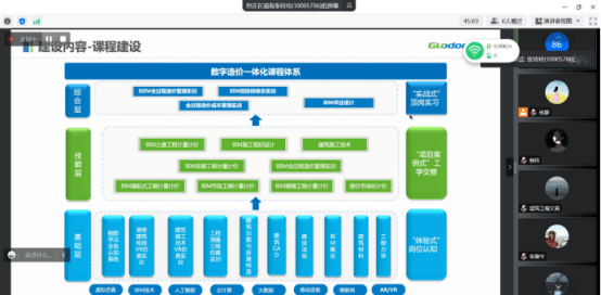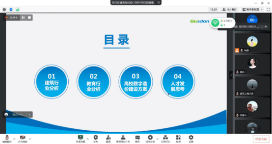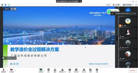 在这个特殊的时期,本次培训特地邀请了广联达公司专业培训讲师张玲玲老师通过线上会议的形式进行教学和答疑。本次培训主要着眼于教育行业分析,建筑行业分析,高校数字造价建设方案及人才发展思考四个方面进行,从产业升级出发,揭示数字建筑是未来建筑产业发展的核心引擎,结合教育部职教20条的要求,明确新形势下的造价行业造价人的培养目标,打造全过程、全要素的数字造价一体化课程体系。培训结束后,广联达企业的负责人还与我院教师关于未来学生人才培养方向,实训平台的使用进行了深入探讨,为未来的进一步合作奠定了坚实的基础。