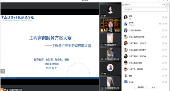2022年12月11日14:00时,工程造价教研室组织2021级工程造价专业学生开展了劳动技能大赛,由于疫情原因,采用腾讯会议线上全程直播的形式,本次参赛的共有8名选手,由左彩霞老师主持评审,张会利老师负责监赛。