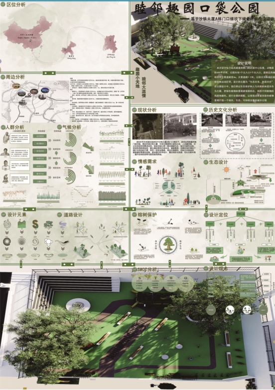 由赵月苑、袁有无、李秋娜老师指导的“睦邻趣园口袋公园——基于沙铁大厦A栋门口梯坎下绿化带的改造建设”项目从生态、场地、人文历史和适老化环境设计角度对基地进行了睦邻友好的微改造设计;由周杰老师指导的“桑榆未晚·适老相伴基于沙铁大厦绿化空间改造”项目则从尊重场地地形、打造适老休闲的康养空间角度展开了生动的设计。