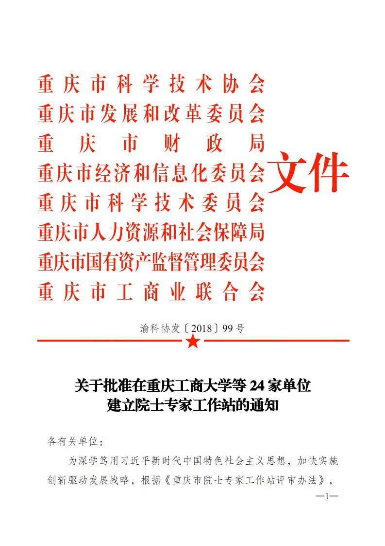 2018年10月29日,重庆市科学技术协会、重庆市发展改革委员会、重庆市财政局、重庆市经济和信息化委员会、重庆市科学技术委员会、重庆市人力资源和社会保障局、重庆市国有资产监督管理委员会、重庆市工商业联合会十部门联合发文《关于批准在重庆工商大学等24家单位建立院士专家工作站的通知》(渝科协发【2018 】99号)批准Kaiyun官方网站登录入口等24家单位建立院士专家工作站,并希望各建站单位珍惜荣誉,抓住机遇,充分发挥院士专家工作站高端智力优势,积极开展战略咨询,推动集聚创新要素,联合开展科技攻关,努力培育创新人才,切实促进产学研用,加速科技成果转化,在加快实施创新驱动发展战略的实践中建功立业,为如期全面建成小康社会、夺取新时代中国特色社会主义伟大胜利作出积极贡献。