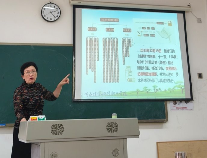 陈晓辉老师围绕主题从党的历史导入,从学习《条例》目的要求、时间安排、重要意义、修订过程、特点看点、学习效果、收获体会等几个方面,同时还配有大量案例带领全体党员学习《条例》。