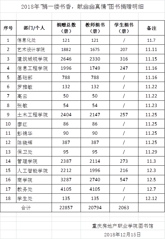 在此,我们谨代表重庆房地产职业学院全体师生向图书捐赠者致以最诚挚的问候和真心的感谢!感谢你们浓浓的爱校之情,感谢你们为学校图书馆建设和发展贡献的力量!
