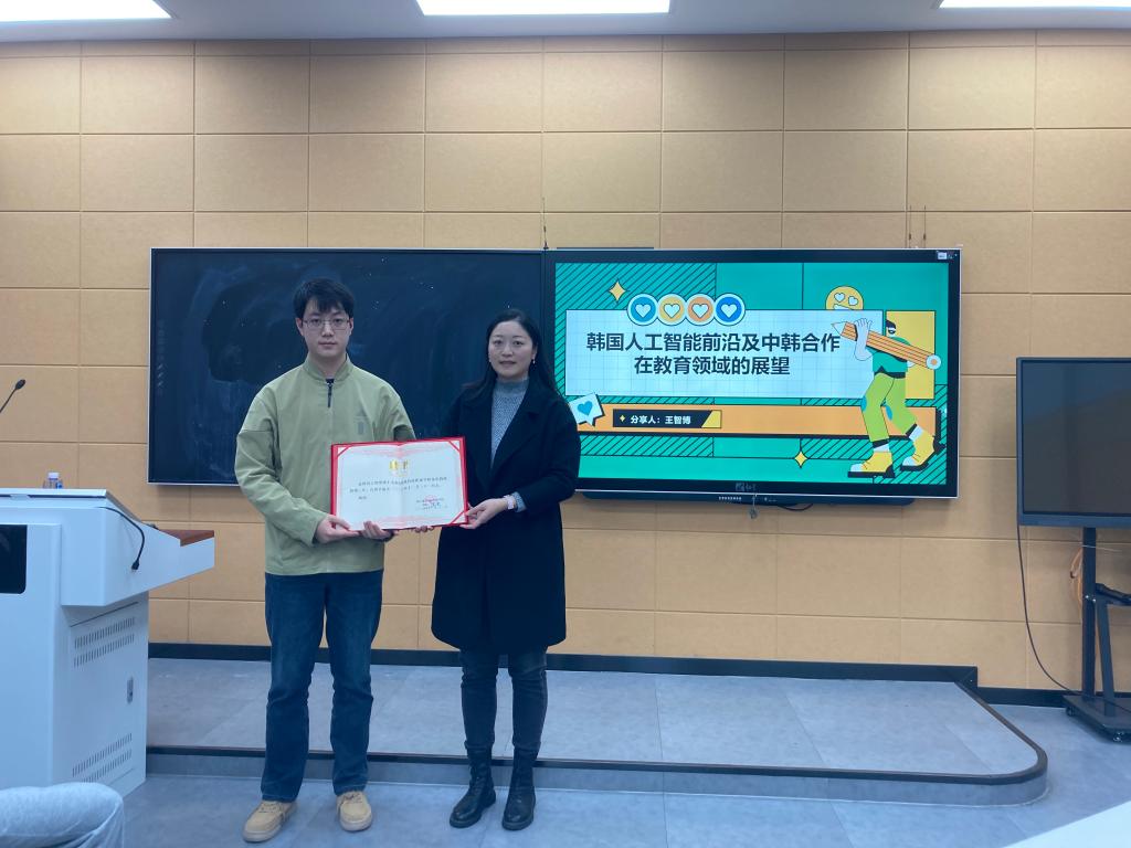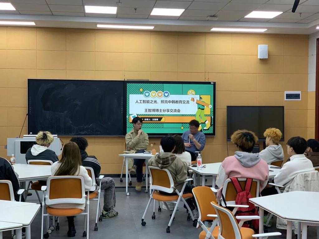 讲座中,王智博博士凭借其深厚的专业知识和丰富的研究经验,深入浅出地向在场听众介绍了韩国人工智能领域的前沿动态,同时对中韩在教育领域合作的未来发展方向进行了展望。他用生动的案例、详实的数据以及独到的见解,让大家对这一领域有了更为清晰且深刻的认识,拓宽了师生们的国际视野,也为同学们打开了一扇了解国外先进学术和教育合作的窗口。
