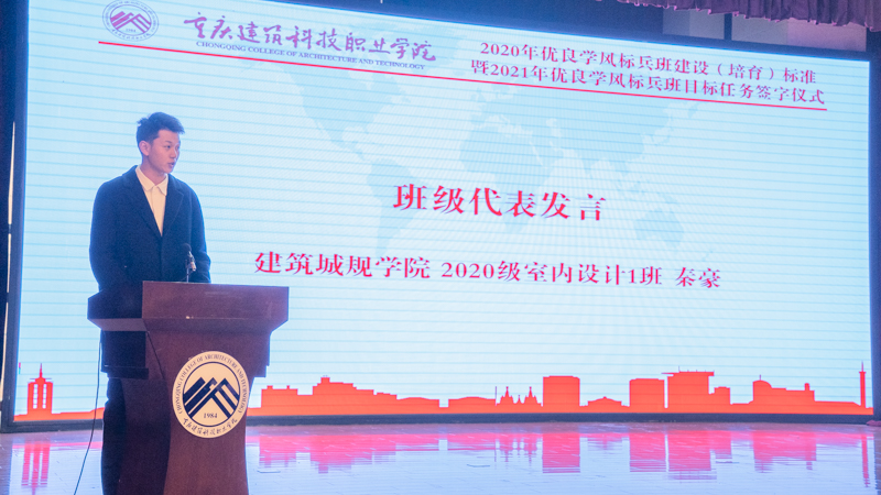 建筑城规学院2020级建筑室内设计1班秦豪同学在发言中说,他代表这15个优良学风建设(培育)标兵班做出慎重承诺:一定谨记这次签字仪式带来的仪式感,严格按建设(培育)标准,一条条对标对表,带领全班同学建设好班级、服务好班级,把“标杆”两个字践行得更加鲜活、更加有说服力、更加有号召力和感染力,请老师放心、领导放心、学校放心!