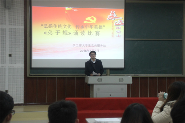 为了弘扬传统文化,传承中华美德,加强学生党员和入党积极分子的德育教育,2016年1月6日,学工部在3205教室,组织党员服务站102名学生党员、入党积极分子分成5支小队,开展了《弟子规》诵读比赛。学院督导室谭银锋老师、学工部大学生成长教育教研室赖泽凤老师、重庆市高校辅导员技能大赛第三名辅导员刘小进老师到会并作了精彩点评。