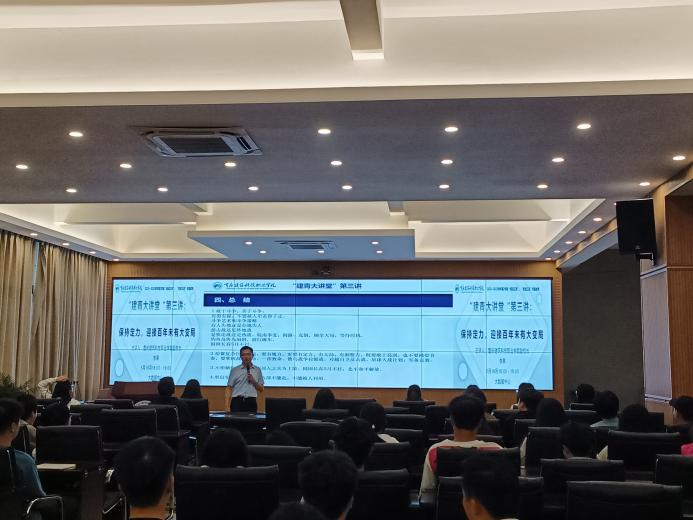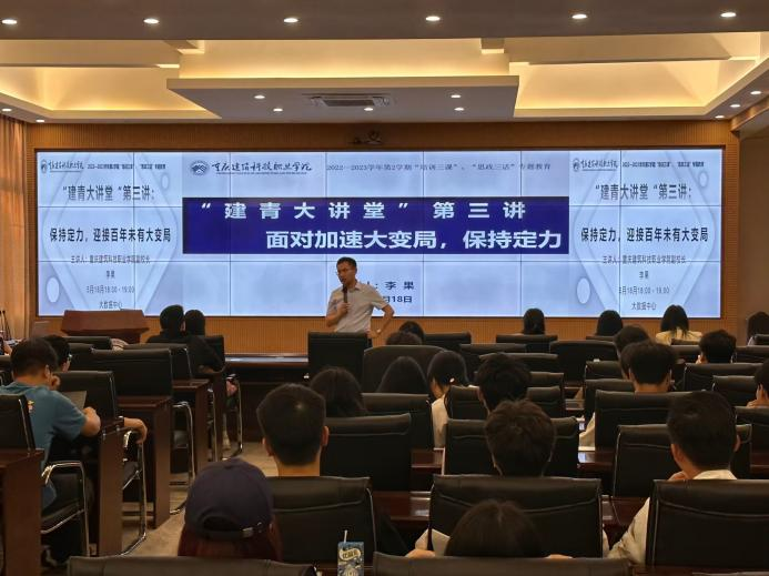 2023年5月18日18:00,学校学工部组织的“建青大讲堂”第三讲专题讲座在大数据中心举行,学校副校长李果“保持定力,迎接百年未有大变局”为题进行讲座,值班书记、专职辅导员以及在校学生代表69人参与。