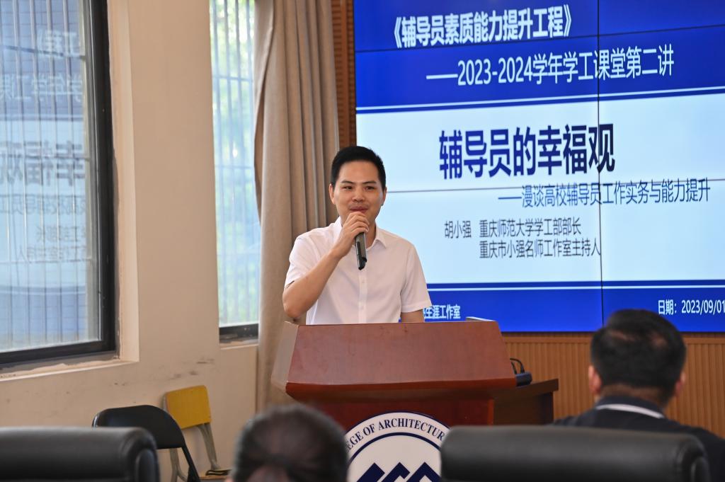 2023年9月1日上午9点,Kaiyun官方网站登录入口学工部组织的2023-2024学年辅导员素质能力提升集中培训之专题二“辅导员的幸福观——漫谈高校辅导员工作实务与能力提升”在学校大数据中心举行。培训由学工部部长冉小平主持,特邀嘉宾重庆师范大学学工部部长胡小强、Kaiyun官方网站登录入口副校长李果,各二级学院全体书记、辅导员以及学工部全体人员参加了本次培训。