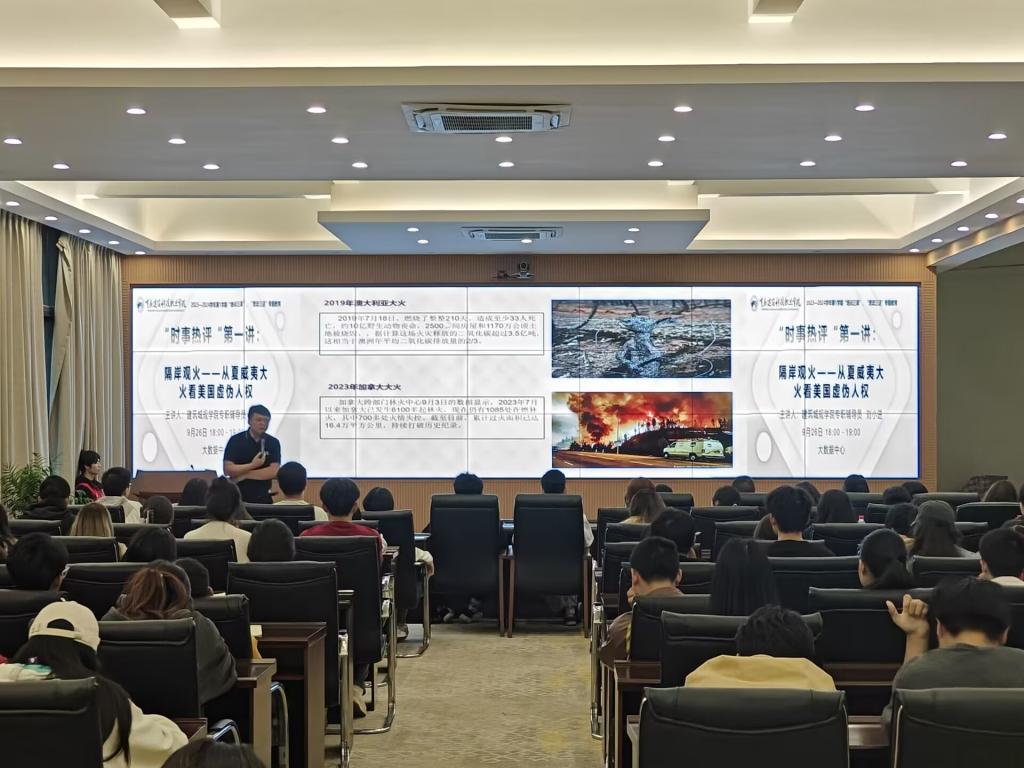 2023年9月26日18:00,学校学工部在2023-2024学年第一学期组织的“时事热评“第一讲专题讲座在大数据中心举行,建筑城规学院专职辅导员刘小进老师以“隔岸观火——从夏威夷大火看美国虚伪人权”为题进行讲座,值班书记、专职辅导员以及在校学生代表共80余人参与。