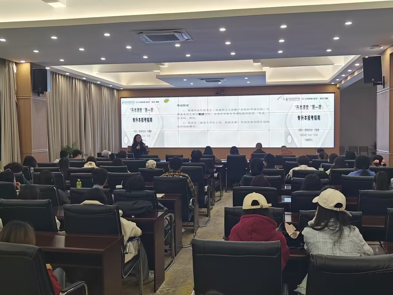 2023年10月24日18:00,学校学工部在2023-2024学年第一学期组织的“升本课堂”第一课专题讲座在大数据中心举行,教务处处长叶颖娟以专升本报考指南为题进行讲座,值班书记、专职辅导员以及在校学生代表共80余人参与。