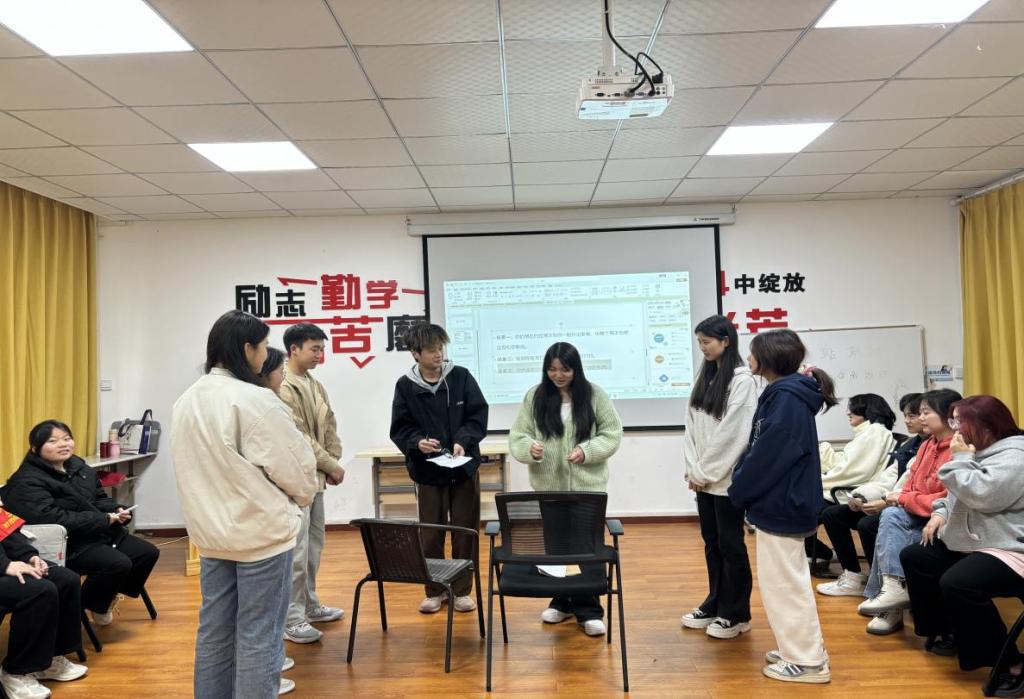 活动主要采用实操体验的方式开展。首先王老师给同学们分发了A4纸让大家写下从小到大令自己开心的事件,王老师采用“大风吹”这种有趣的方式抽取具有某种特征的几个同学来让他们分享自己的开心的事件,同学们都分享了自己生活中多种多样的愉快事件,使得整个环节充满了轻松愉快的氛围。紧接着,在王老师的带领下同学们进入了下一个活动,叫做“情绪ABC”。王老师让同学们采用心理剧的形式演绎不同的人对同一件事会产生不同的情绪。其后,王老师让大家将自己不开心的事写在纸上,组成“心情纸张”,每个人都将自己的“心情纸张”揉成团攥在手里,进行冥想放松练习。在舒缓的音乐中,同学们闭上眼睛,跟着引导词进入冥想状态。冥想结束后,王老师让大家把写着不开心事件的“心情纸张”丢进垃圾桶中,丢出心情纸团时,丢掉自我负面情绪,感觉一身轻松,从而拥抱净化后的自我。