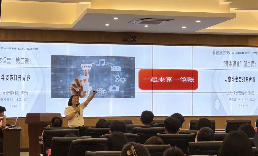 2024年4月16日18:00,由学校学工部组织的“升本课堂”第二课:以奋斗姿态打开青春专题讲座在大数据中心举行,房地产营销学院专职辅导员周庆莲主持开展讲座,值班书记、专职辅导员以及在校学生代表90余人参与。