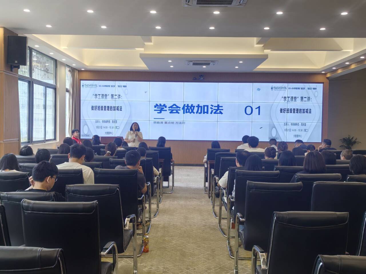 2024年5月21日14:00,学工部在2023-2024学年第一学期组织的“学工课堂”第二讲:做好班级管理的加减法专题讲座在大数据中心举行,由房地产营销学院辅导员周庆莲老师主讲,学工部长冉小平、全体书记、专职辅导员共60余人参与。