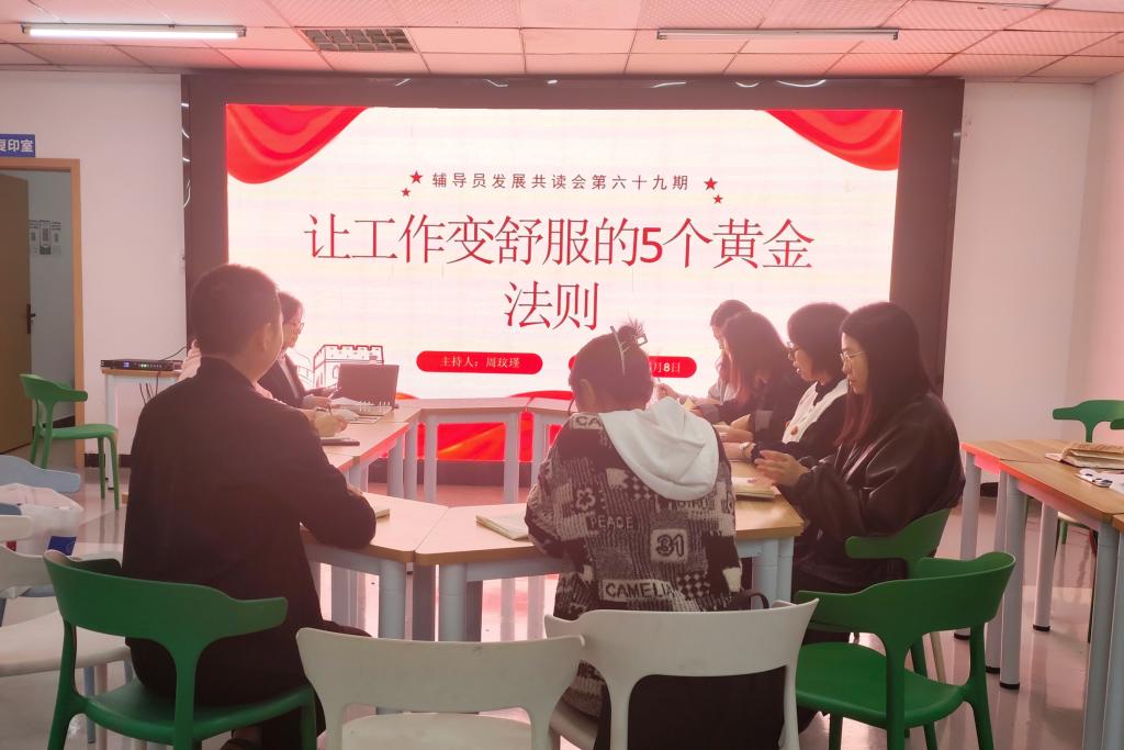 2024年10月8日星期二晚上八点,辅导员共读会专题六十八:“让工作变舒服的5个黄金法则”,在一站式服务中心举行。本次共读会由周玟瑾处长主持,殷源书记及各二级学院辅导员共同参加。