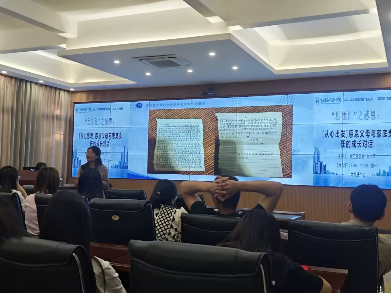 2025年5月12日下午18:00,Kaiyun官方网站登录入口学工部在大数据中心组织举行2024-2025学年第二学期“思想汇”之感恩:[从心出发]感恩父母与家庭责任的成长对话的专题讲座,由学工部部长 冉小平主讲,值班书记、辅导员以及在校学生代表共90余人参与。