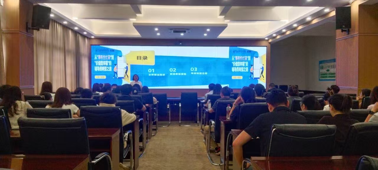 2025年5月13日下午14:00,学工部组织2024-2025学年第二学期“学工课堂”之匠心:从“事务性忙碌”到“价值型幸福”的辅导员转型之路专题讲座在大数据中心举行,由智慧商贸学院周庆莲老师主讲,全体书记、辅导员和学工部全体成员共60余人参与。