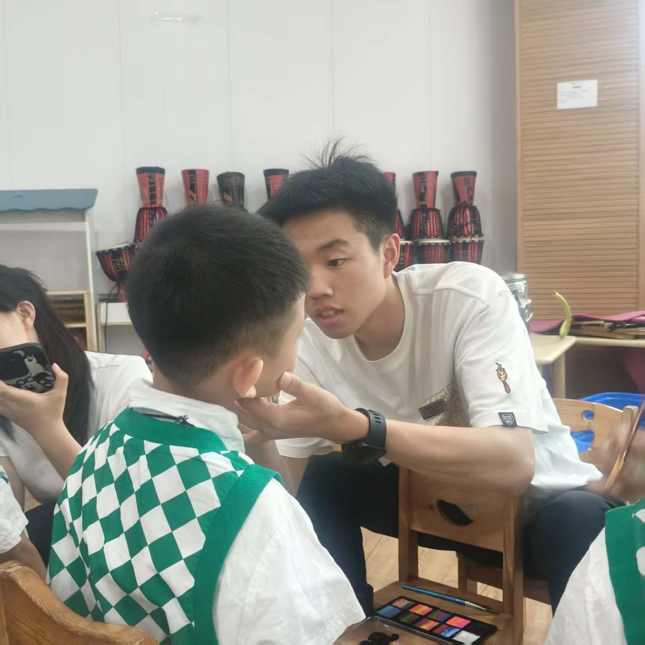 除了为孩子们化妆,志愿者们还积极与孩子们亲切互动,趣味小游戏轮番上演,幼儿园内充满了欢声笑语。志愿者们蹲下身子,耐心倾听孩子们的奇思妙想,与他们一起畅想六一表演的精彩瞬间,给予孩子们满满的鼓励与支持,让他们对即将到来的演出充满憧憬。