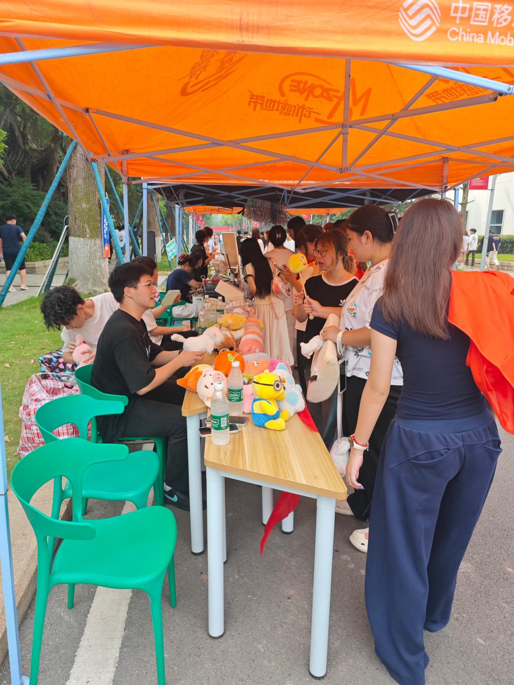 这里的商品琳琅满目,让人目不暇接。瞧,那一排包装精致的项链,在阳光下闪着微光,简约的设计、小巧的吊坠,无论是日常佩戴还是搭配小裙子,都能瞬间提升时尚感;手机壳专区更是丰富多彩,有可爱的海绵宝宝图案,充满童趣,仿佛能把人带回童年时光;还有梦幻的星球元素,神秘又浪漫,每一款都让人爱不释手。贴纸摊位也人气爆棚,可爱的凯蒂猫、酷炫的骷髅图案,各种风格应有尽有。同学们在摊前,精心挑选,准备用这些小贴纸为自己的笔记本、手机增添个性。除了这些,还有散发着文艺气息的书籍、实用的文具、漂亮的小饰品……每一件物品都带着前主人的故事,等待着新的缘分。
