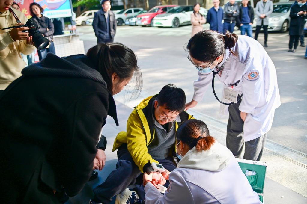 演练模拟场景设定为午餐高峰时段,一名学生在食堂用餐后,突然出现恶心、呕吐、剧烈腹痛,并伴随胸闷、憋气、呼吸困难等严重症状。身旁同学发现异常后,立即大声呼救,现场气氛一度紧张。同学们临危不乱,迅速分头行动:一名同学第一时间拨打120急救电话,清晰说明事发地点、人员情况及症状;另一名同学则立即向辅导员田振老师报告险情;同时,其他在场同学尽力维持秩序,并安抚患病同学。