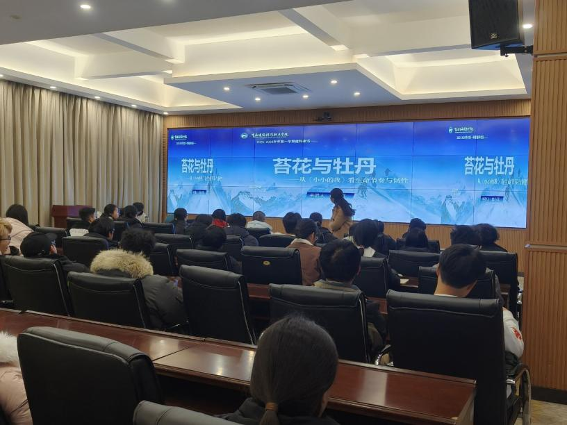 2025年12月16日下午18:00,由学校学工部组织2025-2026学年第一学期“建科夜话”之生命的韧性:苔花与牡丹——从《小小的我》看生命节奏与韧性专题讲座在大数据中心举行。本次讲座由学校学工部部长冉小平老师主讲,值班书记、辅导员以及在校学生代表共90人共同参加。