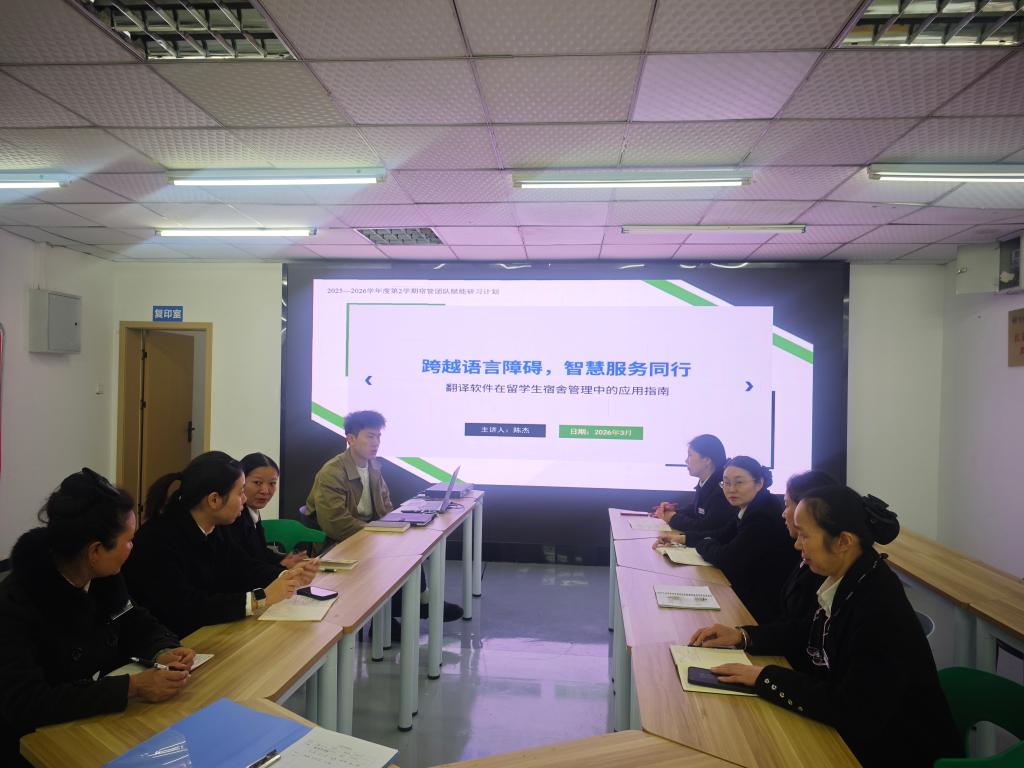 为进一步提升留学生宿舍管理水平,增强宿管人员的沟通能力与服务意识,2026年3月13日,“一站式”学生社区服务中心开展了以“跨越语言障碍,智慧服务同行”为主题的宿管团队赋能研习计划专题培训。本次培训由经验丰富的宿管科骨干陈杰老师主讲,围绕翻译软件在留学生宿舍管理中的应用展开,宿管老师们积极参与。