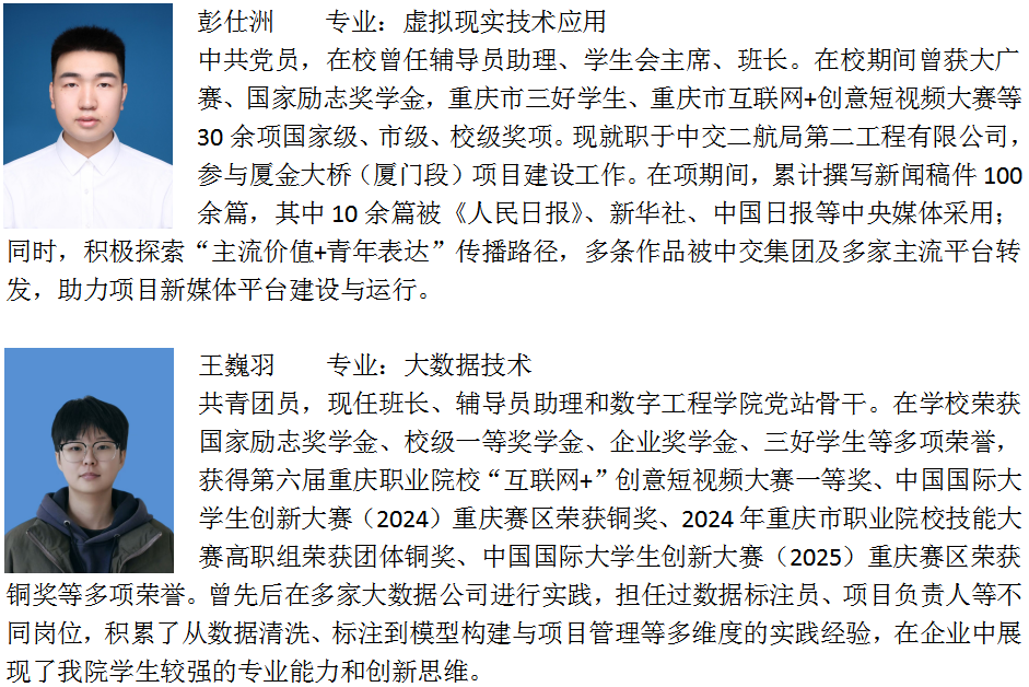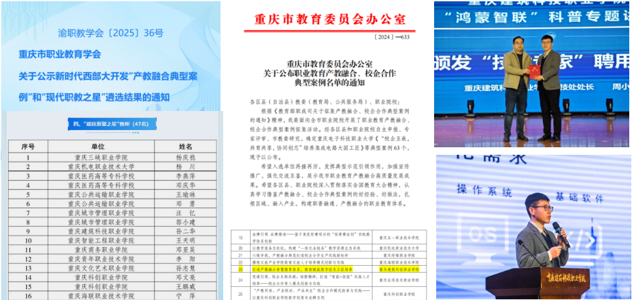 数字工程学院产教融合成果显著,近三年在人才培养及师资建设方面,5 个专业学生行业资质认证通过率超 80%,学生双创奖项20余项,双师型教师占比近60%;在品牌影响力建设上,学院作为数智赋能行业产教融合共同体单位,积极推动数智赋能行业发展,校企联合完成教育部供需对接就业育人项目5项,多次获重庆市产教融合典型案例、重庆市职业院校数字赋能职业教育课程建设优秀案例等荣誉。