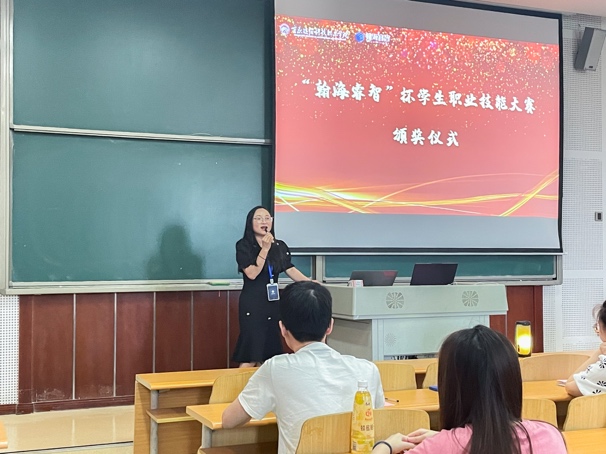颁奖仪式开始前,由翰海睿智校区经理刘秀云女士致辞,她提到“翰海睿智杯”学生职业技能大赛为同学们又创造出一个新的展现自我、交流的机会,希望同学们在今年第二届的“翰海睿智杯”学生职业技能大赛中,可以踊跃报名、积极参与,在“学中练,练中学”,将所学专业技能融会贯通,以提升专业技能水平。