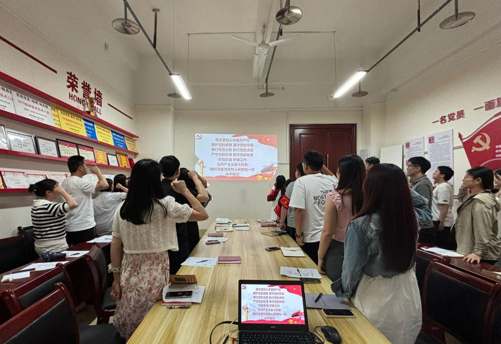 最后,由支部书记张运来同志作总结发言,给予肯定和表示祝贺的同时,强调各位同志在以后的学习生活中要更加刻苦、更加务实、更加自律。在思想和行动上引领身边的同志,在实践当中,不忘初心,不断前行!最后带领全体同志面向党旗宣读入党誓词,气氛庄严。