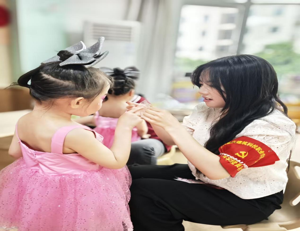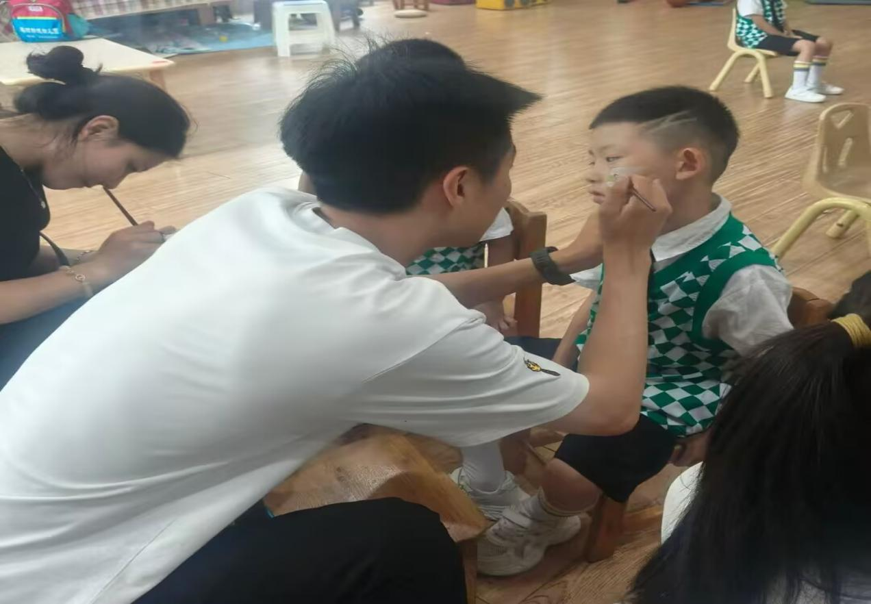 活动当天,志愿者们怀着饱满的热情早早来到幼儿园,他们化身“魔法造型师”,穿梭在孩子们中间,用专业且轻柔的手法为孩子们精心装扮。描绘眉眼时专注认真,轻扫腮红时温柔细致,在志愿者们的巧手下,孩子们变得更加俏皮可爱,纯真的小脸上洋溢着自信与对表演的期待。