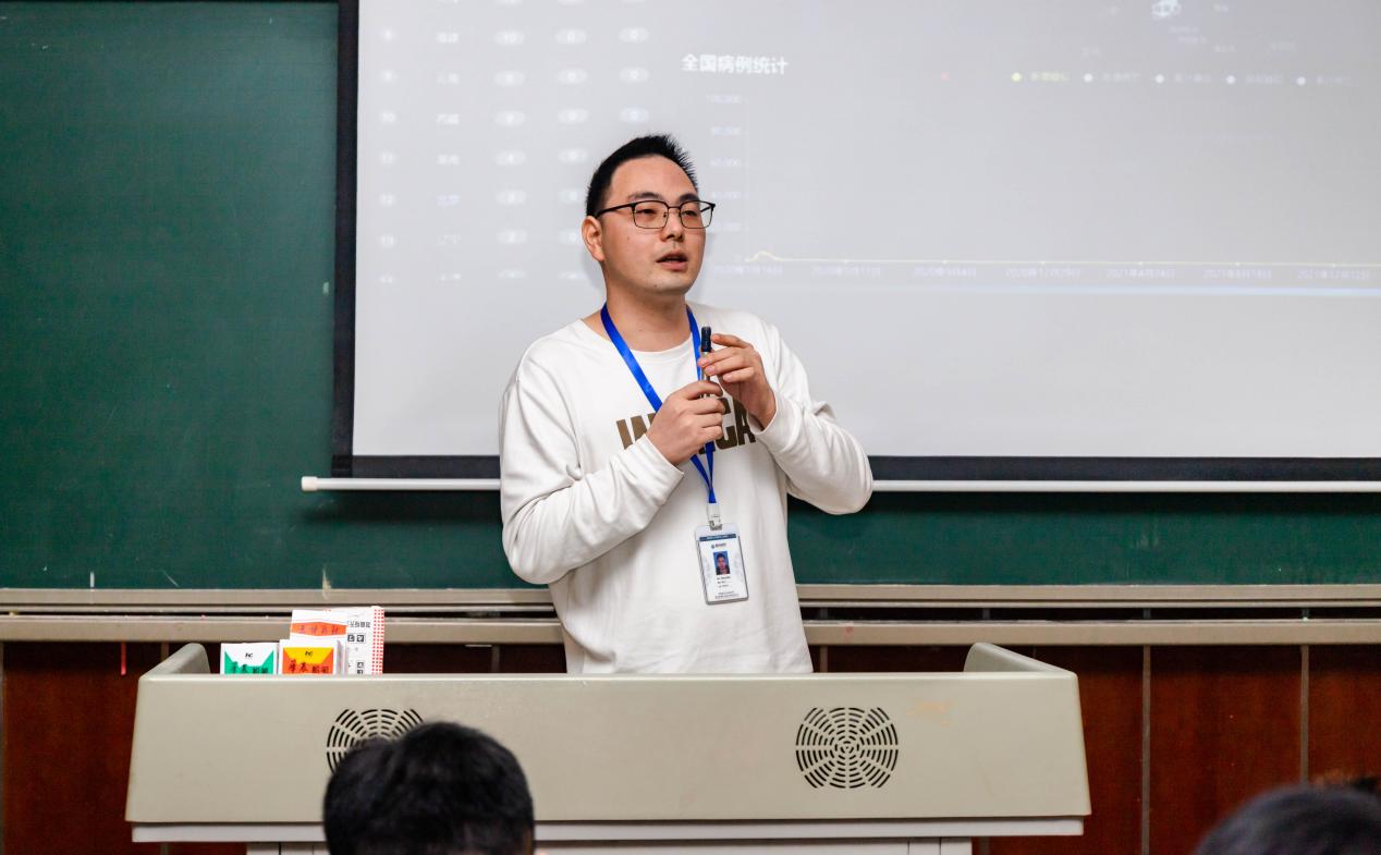 教研室主任廖国敏为同学们一一介绍在场老师随后为同学们介绍大数据技术专业课程设置和就业环境,并对同学们提出学习要求,提出目标明确的重要性,希望同学们在学习过程中能够静心摸索,践行工匠精神,不负青春。接着,企业教师代表崔大洪深入浅出的为同学们讲解什么是“大数据”。从我国传统二十四节气到疫情管控,崔老师丰富的知识存储和专业魅力,让同学们充分领略到大数据的魅力。宣讲会最后,崔老师根据企业工作经验,分享了大数据人才的岗位需求和发展前景,鼓励同学们抓住时代机遇,努力拼搏。