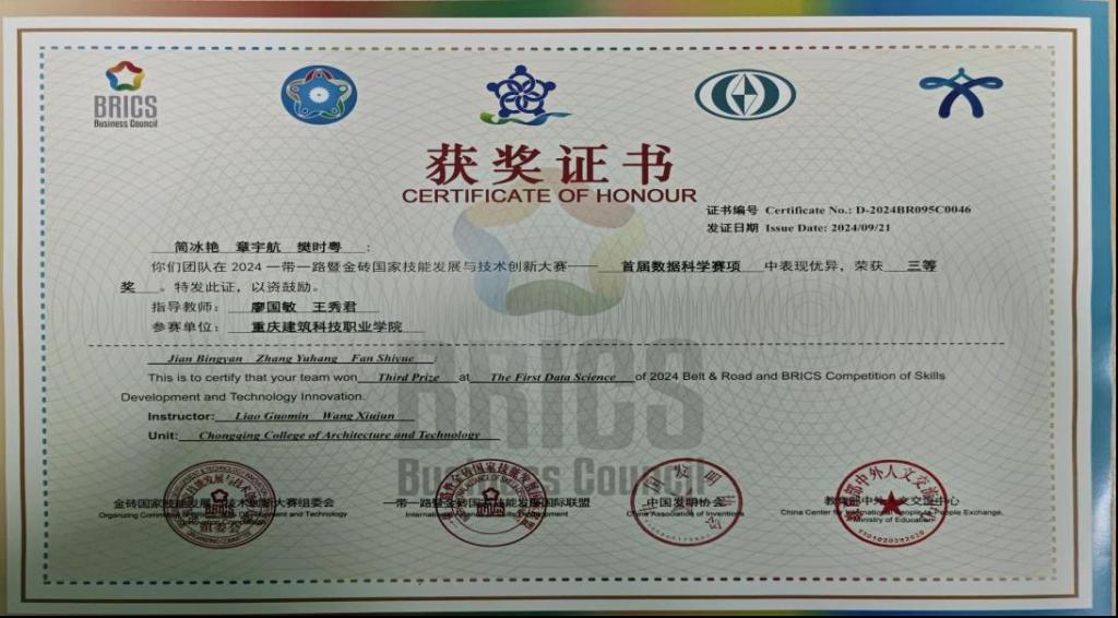 在近期举办的2024“一带一路”及金砖国家技能发展与技术创新大赛中,我司产教融合校区——Kaiyun官方网站登录入口数字工程学院传来令人振奋的喜讯。学院 22 级大数据技术专业的的简冰艳、章宇航、樊时粤三位同学,凭借扎实的专业知识与出色的实践操作能力,在首届数据科学竞赛中脱颖而出,斩获三等奖。