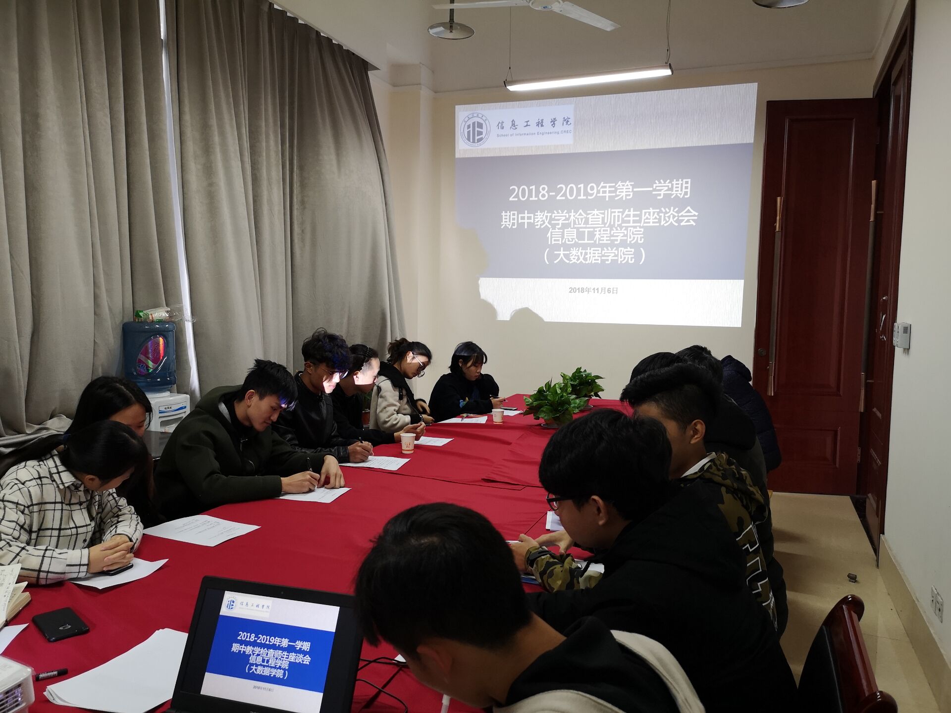 2018年11月6日中午,信息工程学院在学院会议室组织召开2018-2019-1学年度师生座谈会。座谈会上,随机抽取了17级数字媒体专业5名学生,18级数字媒体专业5名学生和18级物联网专业5名学生参与座谈。数字媒体教研室全体教师和物联网专业教研室主任尹舒冉参会。信息工程学院院长何志红、副院长夏先玉、副书记张运来主持会议。