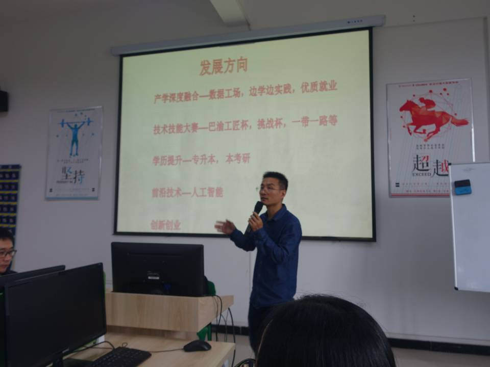 随后,大数据应用技术教研室主任蔡孝成从产学深度融合、技术技能大赛、学历提升、前沿技术和创新创业方面详细的叙述了未来发展方向,并期望同学们在数据工场校内实训过程中都能有积极的表现。然后,云计算教研室专职教师钟涛表示数据工场的初衷是以提供参与实际项目的机会,希望同学们踏实刻苦的学习,摒弃以自我为中心的思想,合理安排自己的学习和工作时间,并在最后任命大数据技术专业学生董星月同学为项目经理。