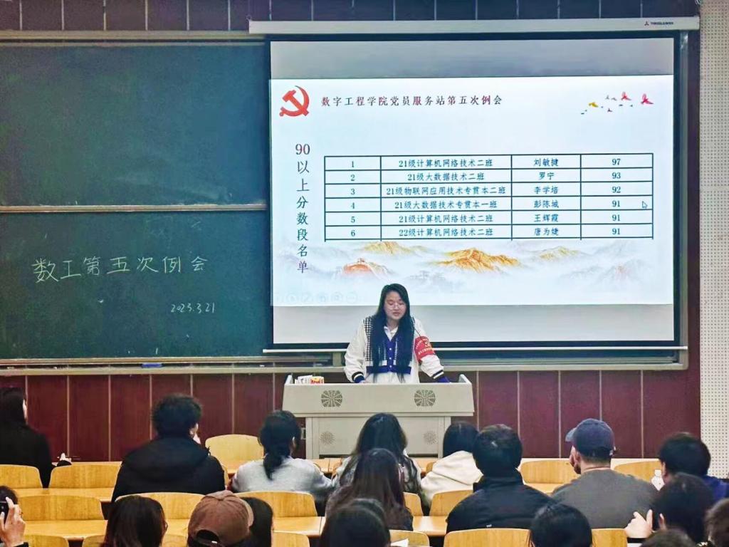 会上,党员服务站数字工程学院分站骨干牟春红,总结了本学期第一次线下党史考试的情况并公布考试成绩。她对在本次党史考试中表现优异的同学提出表扬,并表示希望大家能向优秀的同学学习。同时,也对本次党史考试未及格者提出改正建议,并要求他们撰写一千字的思想报告交于办公室主任周首菁处。
