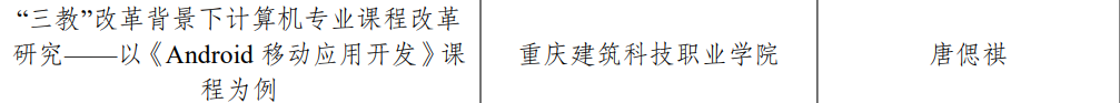 近日,根据《重庆市教育评估研究会职业教育与成人教育评估专业委员会关于公布“三教”改革典型案例和优秀案例认证结果的通知》,我院虚拟现实技术与应用教研室唐偲祺老师撰写的《“三教”改革背景下计算机专业课程改革研究——以《Android 移动应用开发》课程为例》获评重庆市职业院校“三教”改革优秀案例。