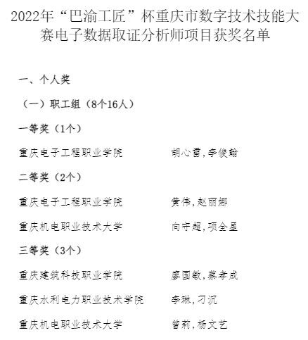 2022年“巴渝工匠”杯重庆市数字技术技能大赛电子数据取证分析师获奖名单