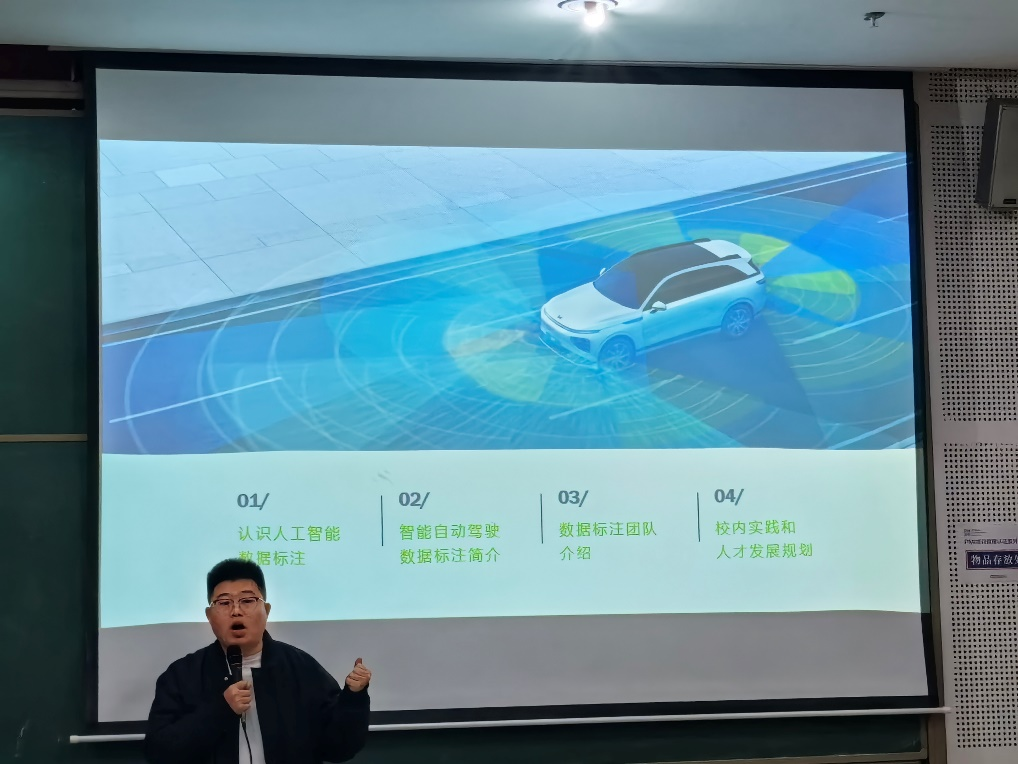 然后,企业负责人段雄工程师通过自动驾驶案例演示,从认识人工智能数据标注、智能自动驾驶数据标注简介、数据标注团队介绍、校内实践和人才发展规划四个方面为学生讲解本次产教融合数据标注项目。
