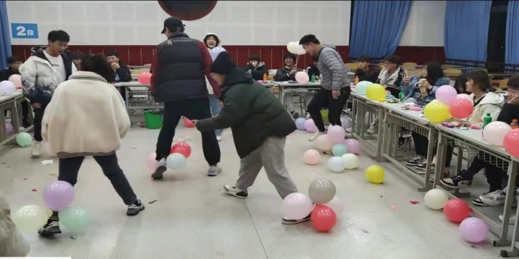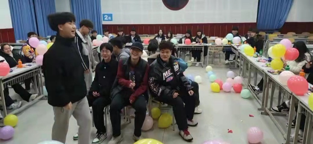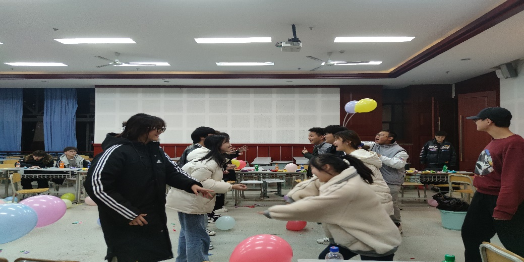 活动开始,辅导员董媛老师向同学们送去了祝福,希望今天这个有趣的班级活动能让大家收获更多美好的友谊,希望大家玩得开心、愉快,提前祝大家元旦快乐。伴随着大家的欢呼声和欢快的歌曲,便进行了有趣的游戏环节。你比我猜、抢凳子、踩气球让现场气氛达到了高潮,同学们积极参与,现场充满了欢声笑语。