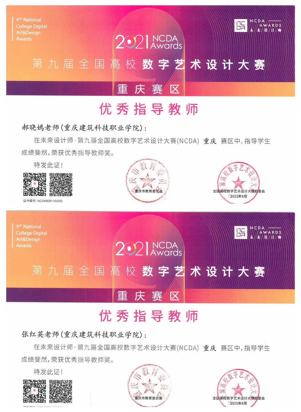 近日,我院师生参加第九届数字艺术大赛证书正式下发,我院在非命题赛道喜获专科学生组一等奖1名,二等奖2名,三等奖5名,教师组二等奖1名,其中张红英、郝晓嫣两位位教师被评为优秀指导教师。