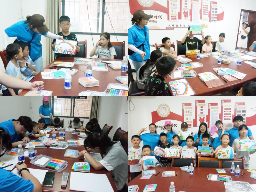 7月6号下午,实践队来到明珠山村村委会,组织村里的留守儿童开展绘画课堂。实践队周泓伶同学以“我们的家乡”为主题,引导小朋友明们打开内心,通过绘画的方式,积极表达自己对家乡的情感。每个孩子都是优秀的创作者,每幅画都蕴含着他们对自己家乡的热爱。课堂最后,小朋友们向大家积极展示自己的作品,每个人的脸上都挂满了笑容。