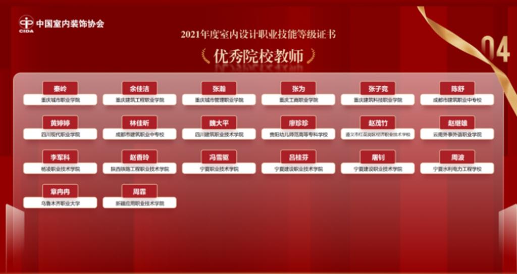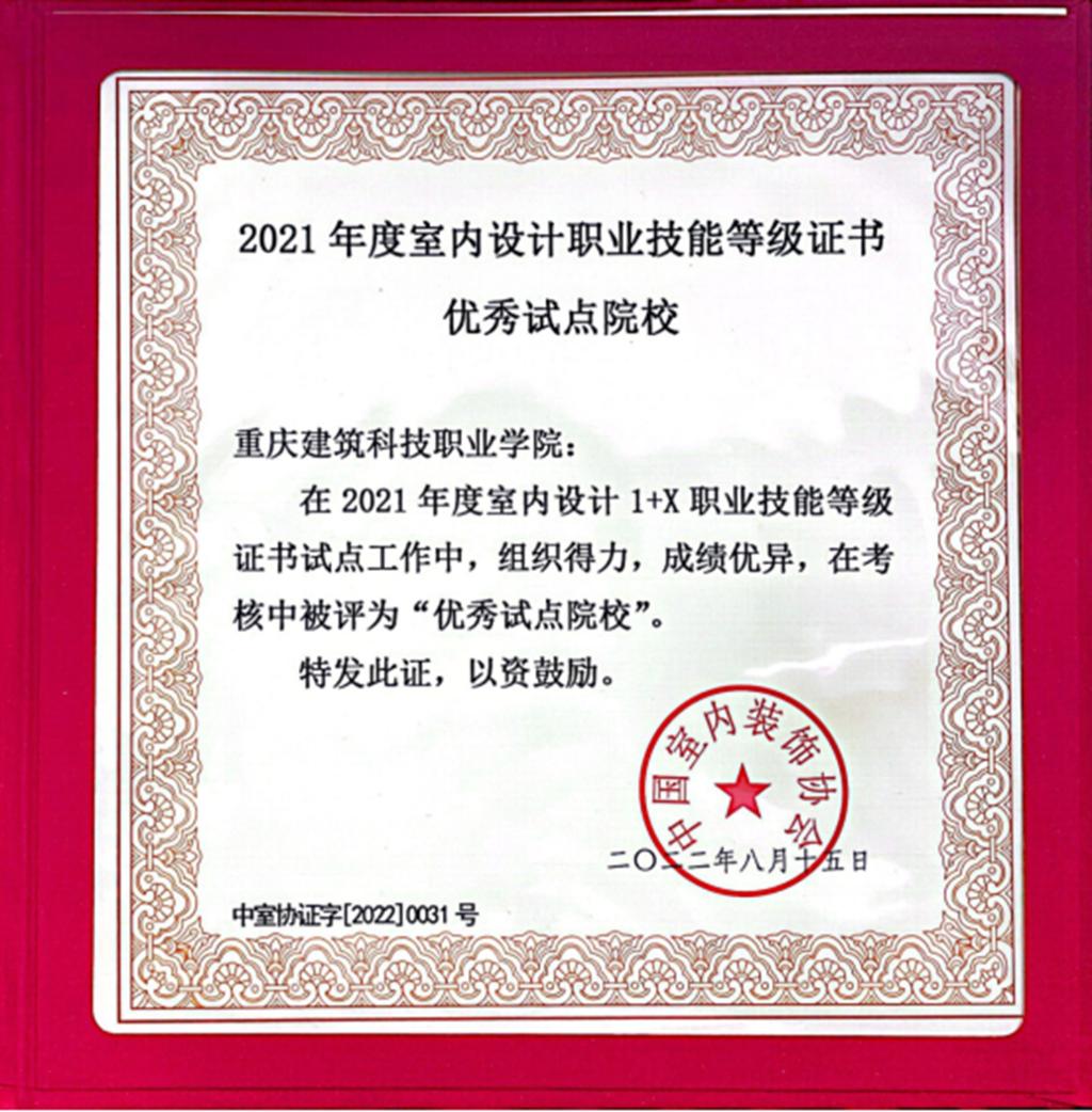 近日中国室内装饰协会举办的1+X证书培训评价组织会发布通知,我院在 “1+X”室内设计职业技能等级证书考培工作中表现突出,被评为2021年度室内设计“1+X证书优秀试点院校”,建筑城规学院教师张子竞被评为2021年度“优秀院校教师”。