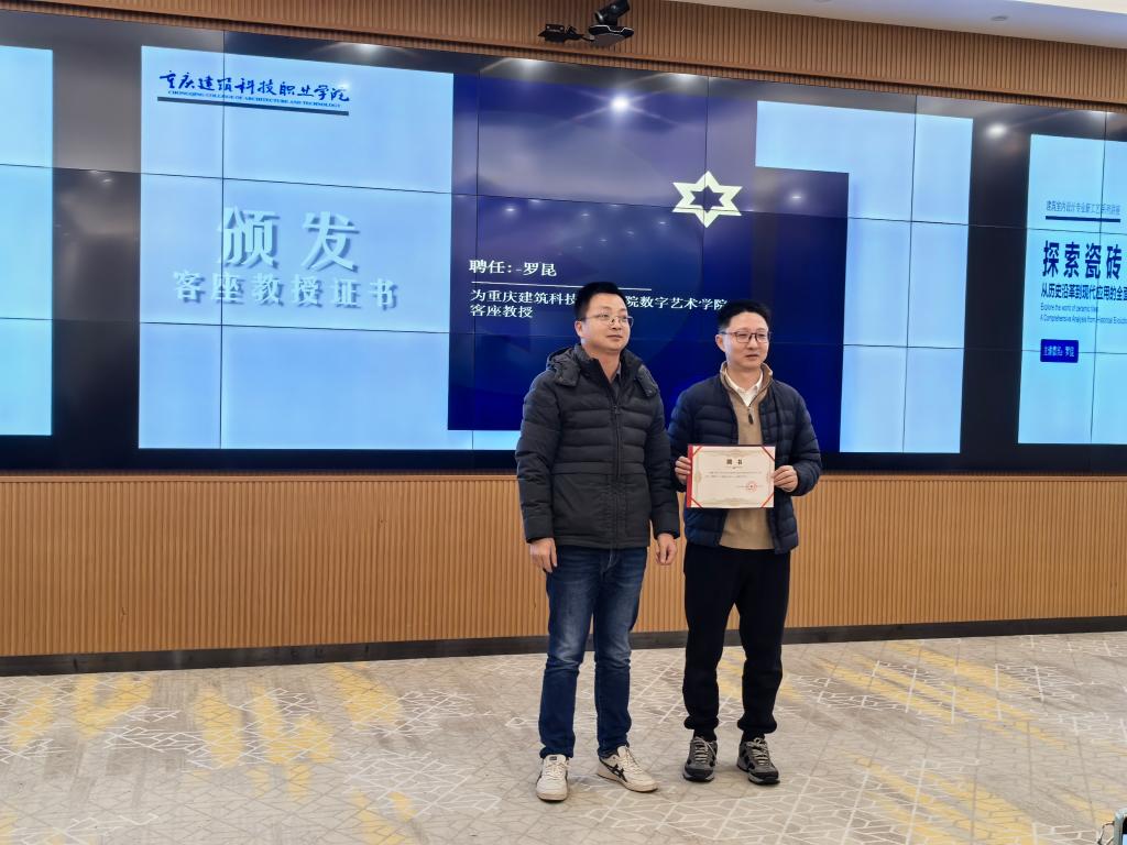 讲座开始,数字艺术学院副院长曾易成上台向罗昆颁发了客座教授证书,标志着双方在学术交流与合作方面迈出了坚实的一步;随后,学院与重庆坤博建筑材料有限公司签订了校企合作协议,双方将在人才培养、科研合作等方面展开深入合作,共同推动建筑行业的创新发展;同时也冠名了建筑室内设计专业的比赛。