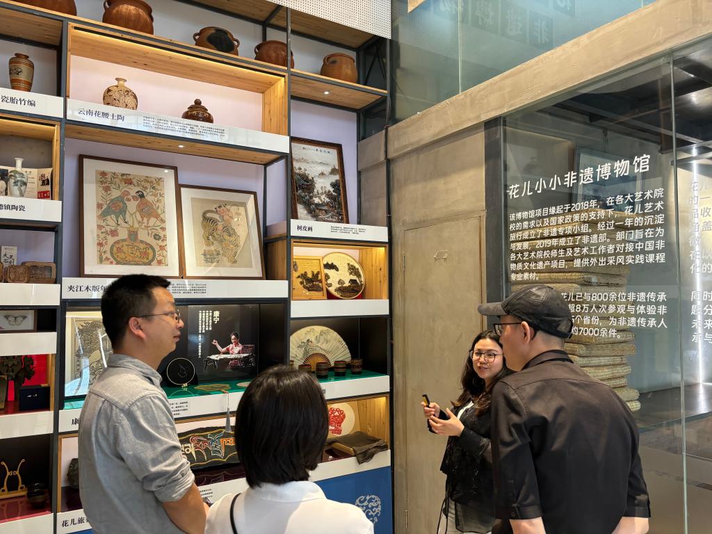 在重庆花儿旅行社副总经理何岸柳、区域负责人蔡英的陪同下,教师团队参观了企业特色空间“花儿小小非遗博物馆”。馆内陈列的鹤庆瓦猫、贵州蜡染、剑川黑陶、苗族刺绣等三十余项传统手工艺品,生动展现了不同地域的非遗文化脉络。通过实物观摩与工艺讲解,教师们深入了解了传统纹样、材料工艺与当代设计融合的可能性,为课程中的传统文化教学积累了宝贵素材。