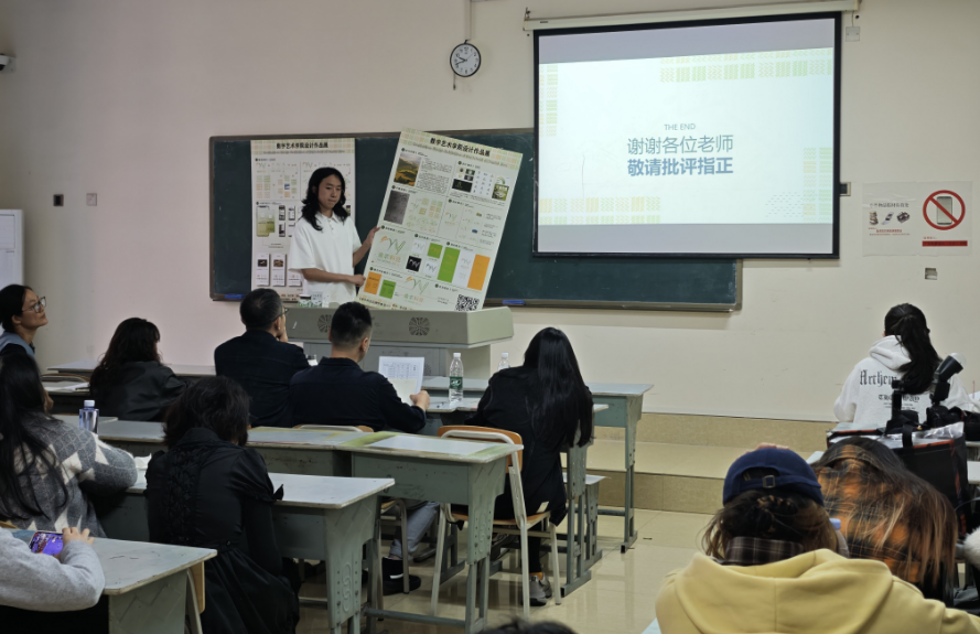 答辩现场秩序井然,氛围热烈。学生们通过PPT汇报、实物展示与多媒体演示等多元形式,从项目构思、艺术表现到技术实现,系统呈现了毕业设计全过程。作品主题多样,涵盖数字品牌视觉系统、界面UI体验优化、包装形象创新设计等,充分体现了“以项目带课程、以产出促学习”的教学理念。评审教师们针对作品的创意逻辑、审美表达、交互体验及技术应用进行了深入提问与专业点评,既肯定了学生们的艺术创新能力与技术执行力,也提出了针对性的改进意见。