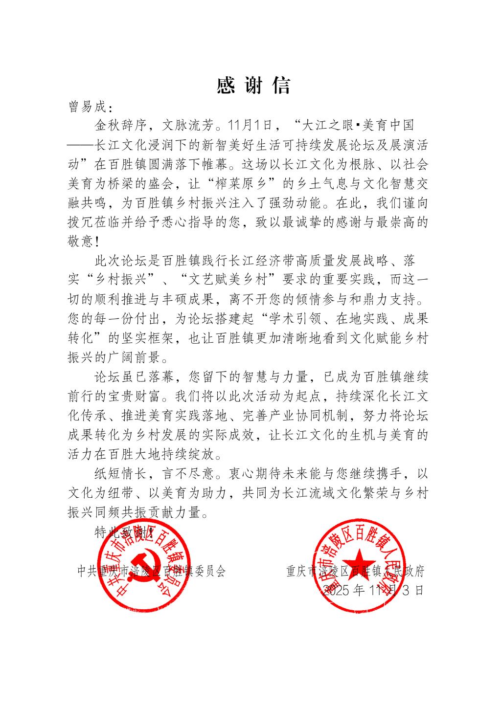 11月1日,数字艺术学院副院长曾易成应邀参加“大江之眼·美育中国——长江文化浸润下的新智美好生活可持续发展论坛及展演”,活动在涪陵区百胜镇拉开帷幕。