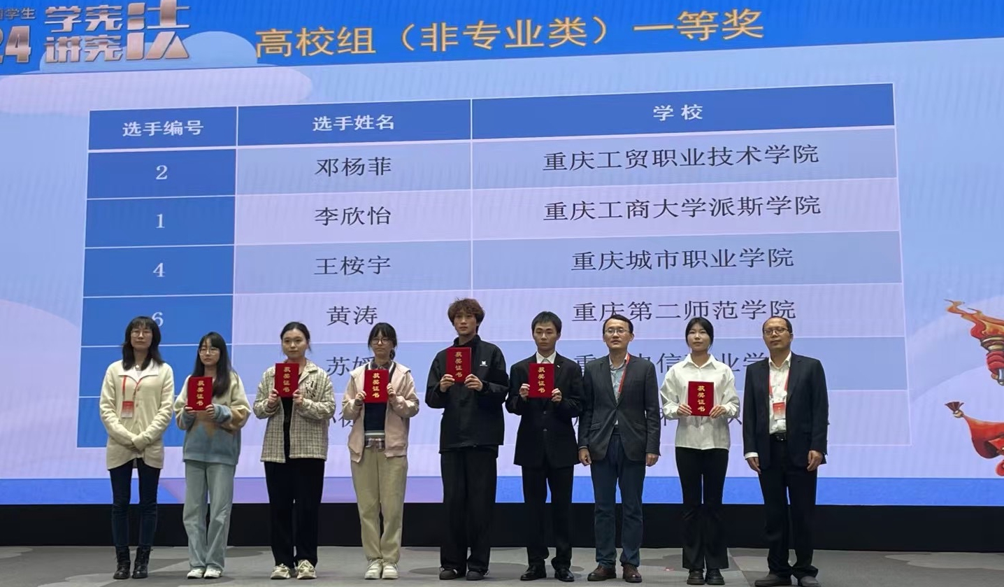 2024年11月9日,第九届全国学生“学宪法 讲宪法”重庆市总决赛圆满落下帷幕,我院孙徐娅同学以出色的表现重庆市总决赛法治素养竞赛中荣获一等奖