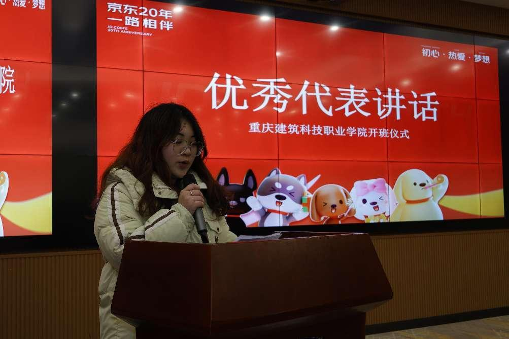 最后,企业对本次培训期间表现优秀小组进行了表彰,并由优秀学生代表余勤上台发言,感谢学校提供了京东这个优秀的实训平台,也感谢企业主管对她的指导和帮助,表示一定会不断努力充实自己,实现自我价值。