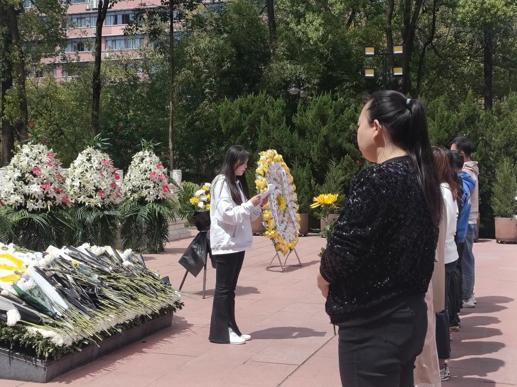 活动现场,两名学生代表双手抬起花圈怀着敬意缓缓前进,将花圈郑重地摆放在烈士墓前,向烈士传达崇高的敬意和深切的悼念。在场全体师生肃立默哀、鞠躬,深切缅怀追忆为人民抛头颅洒热血的革命英烈。