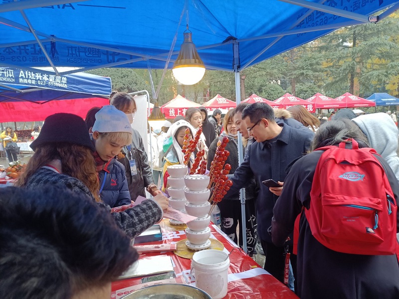 其中,区县特色扶贫产品区是现场销售热度最活跃的区域。为切实通过消费为扶贫助力,房地产营销学院发动全院师生,通过线上线下的方式,联络多个区县,为他们解决当地特色农产品滞销的问题。奉节的脐橙、忠县的血橙、綦江赶水的萝卜干和风味豆腐乳、荣昌的花生酥、巴南木洞的蜜枣、巫溪的腊味……全部都来到了活动现场。同学们在试吃之后,都纷纷竖起了大拇指,当然也忍不住“剁手”,好几种产品都已脱销。